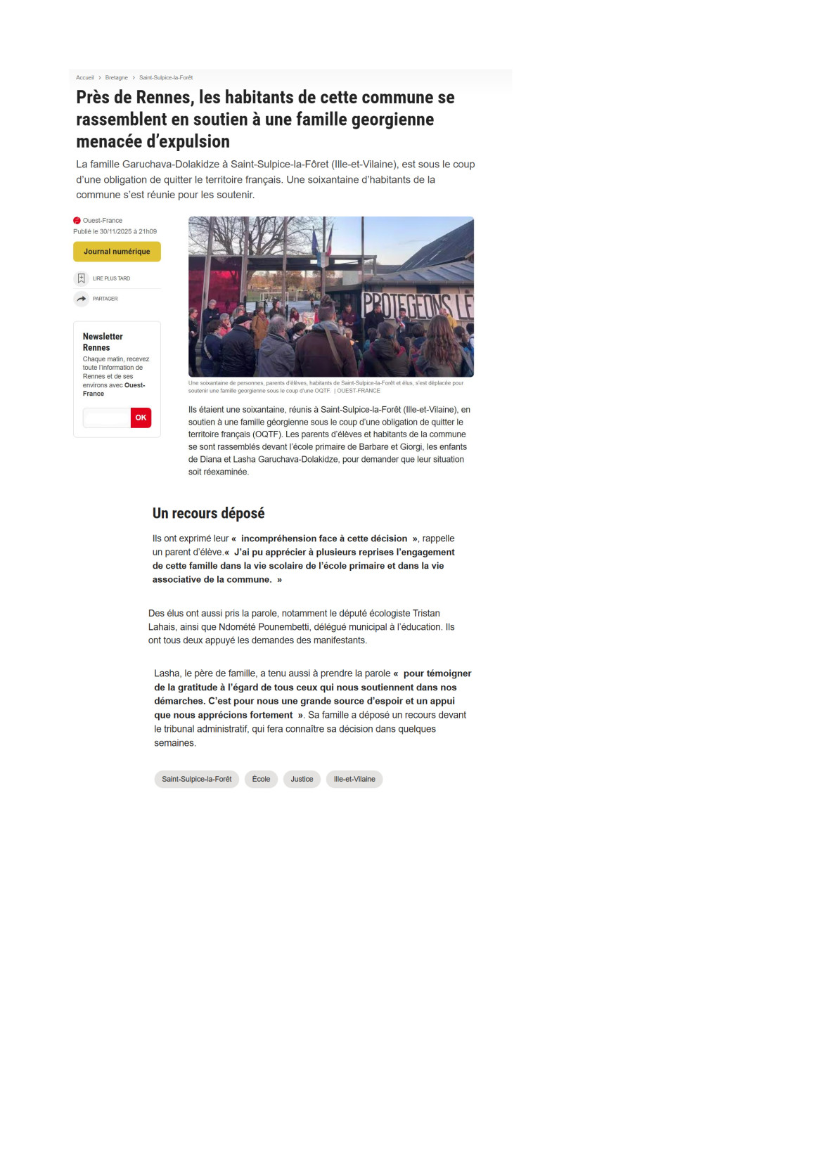 Suite à un mouvement de mobilisation citoyenne, la famille a pu bénéficier d’un logement mis à disposition par la municipalité de Saint-Sulpice-la-Forêt, dans le cadre du dispositif de mise à l’abri de Rennes Métropole. Diana et Lasha participent à la vie du village par leur engagement dans différentes associations et actions de bénévolat, et ils ont tissé de nombreux liens avec les habitant·es.